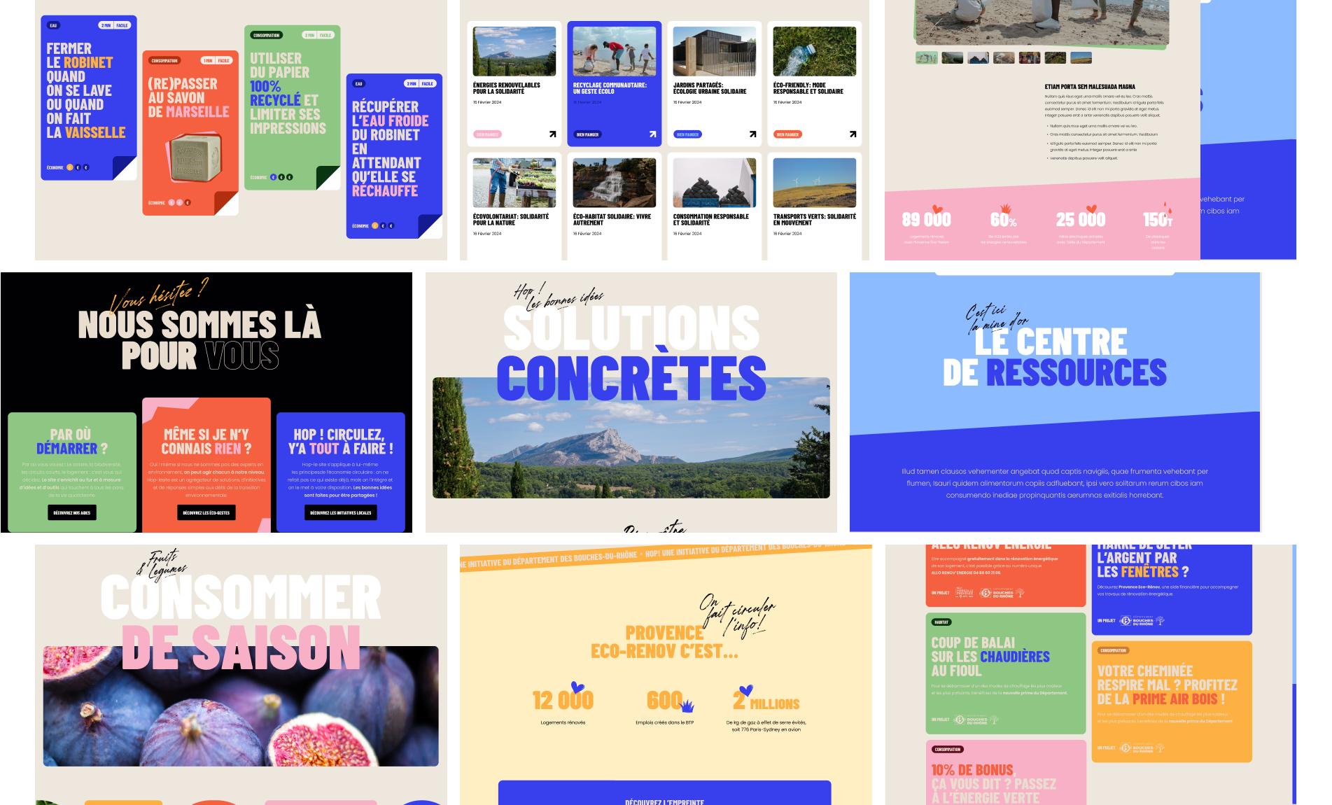 Pour le site HOP! du Département des Bouches-du-Rhône, nous avons conçu une plateforme accessible et éco-conçue : navigation claire, design illustré et contenus adaptés à différents niveaux d’engagement. Résultat : un site pédagogique et inclusif qui incarne la transition écologique.